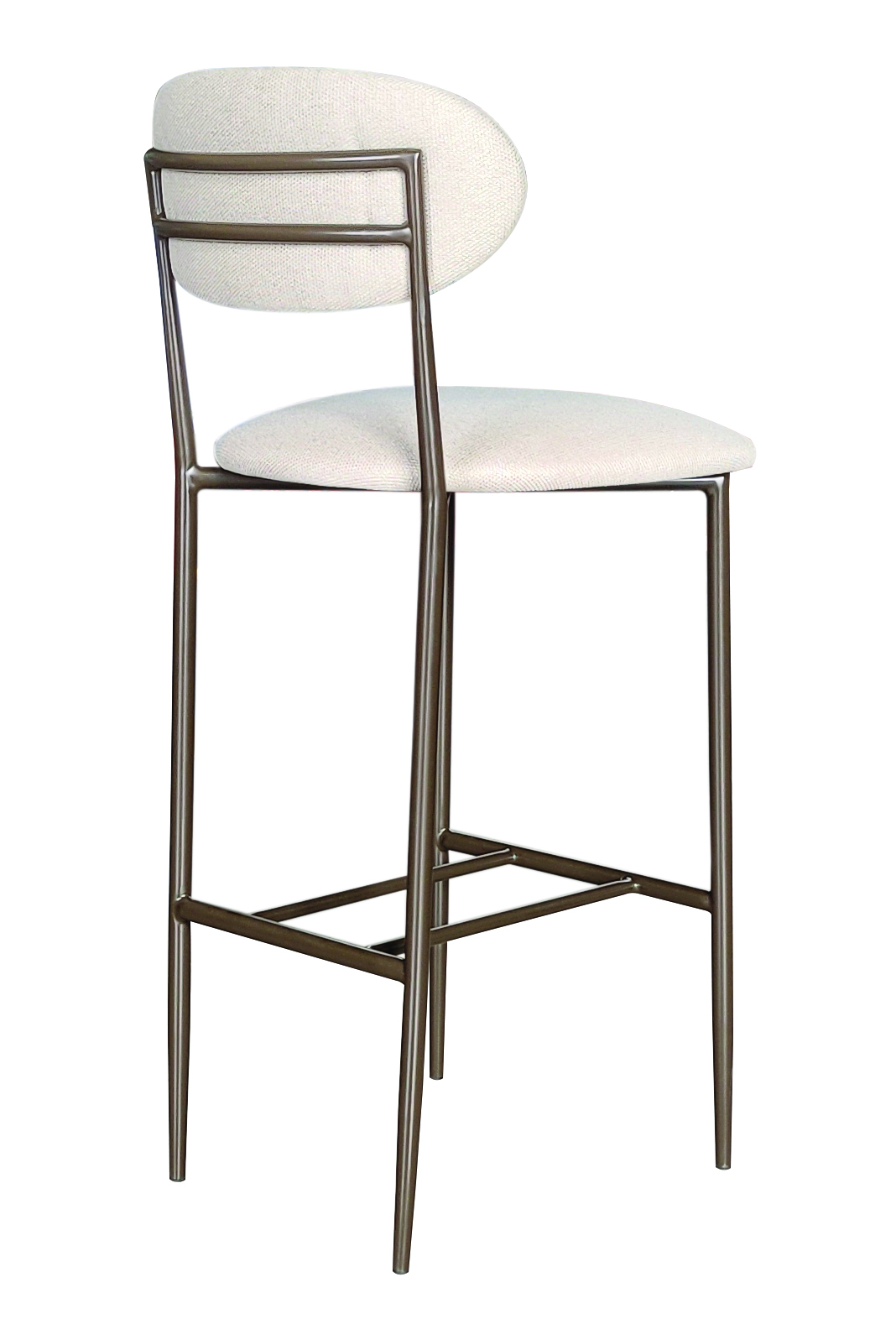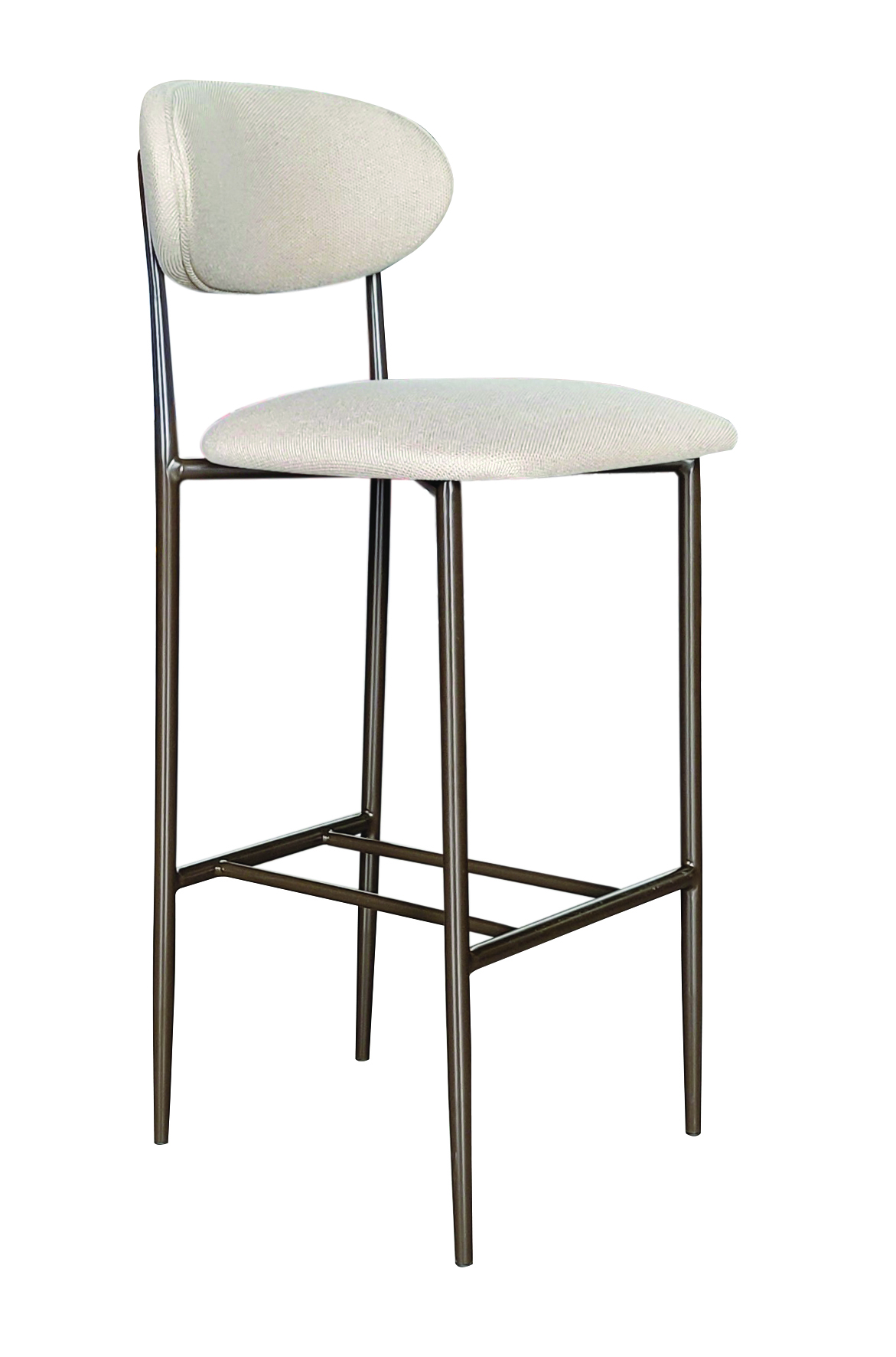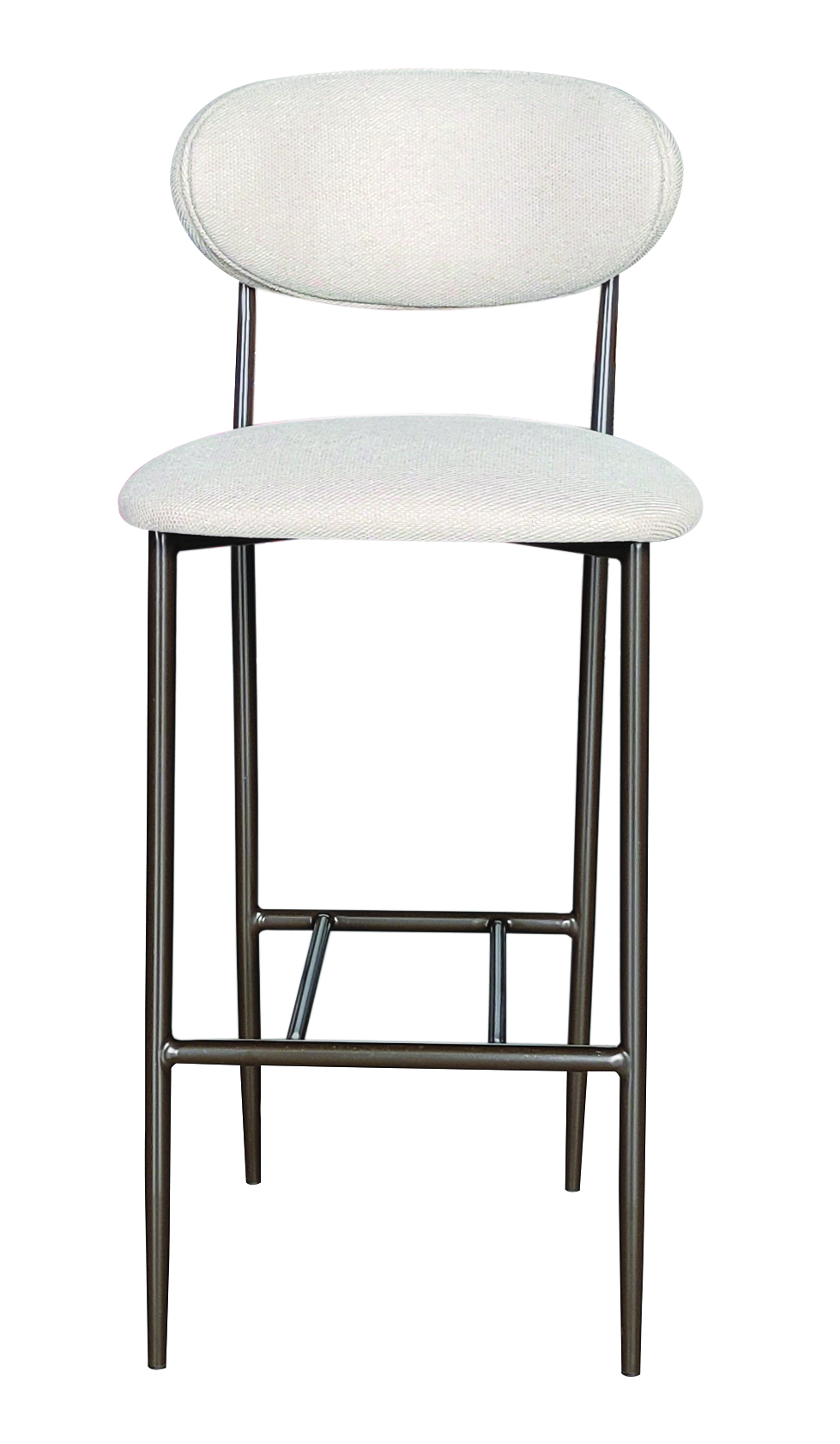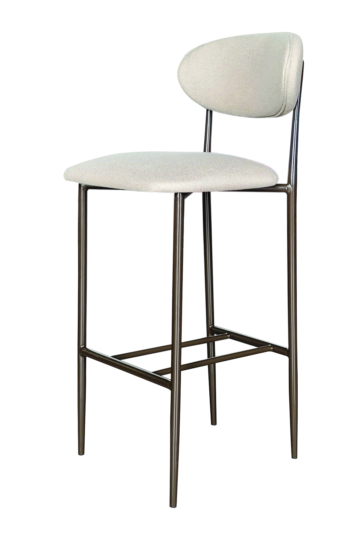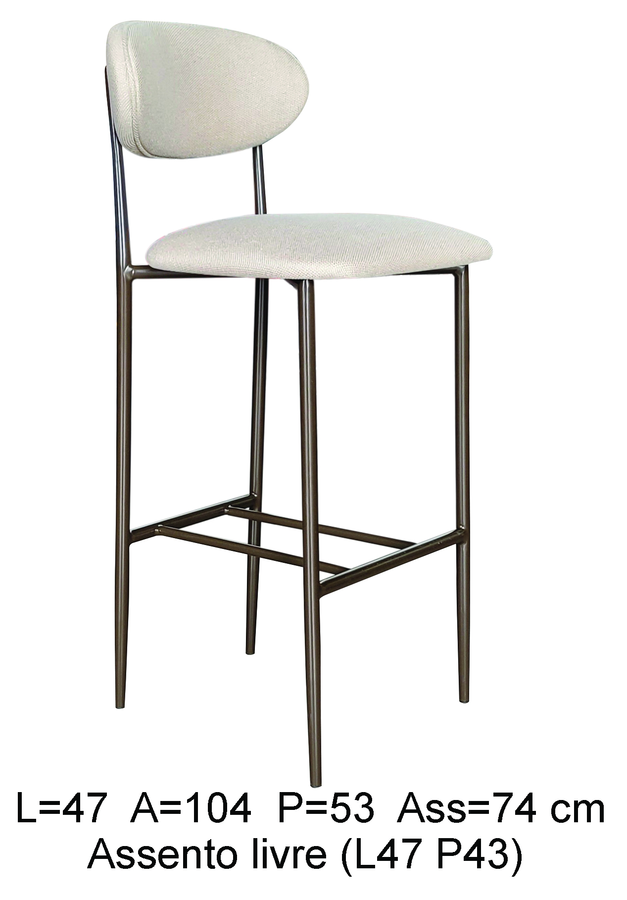 Banqueta com estrutura em aço carbono com acabamento em pintura epóxi, assento e encosto em compensado de madeira anatômico estofados.