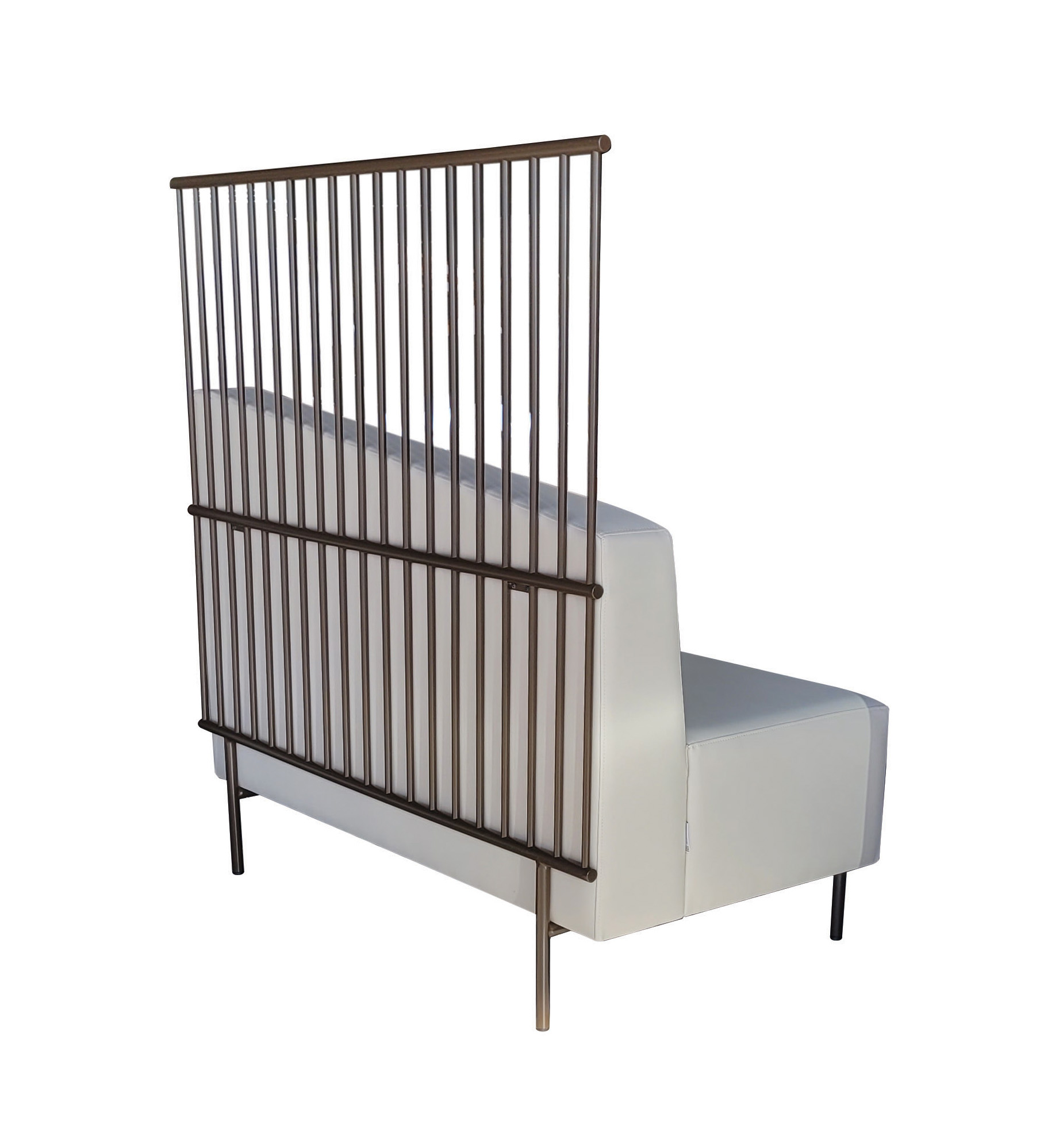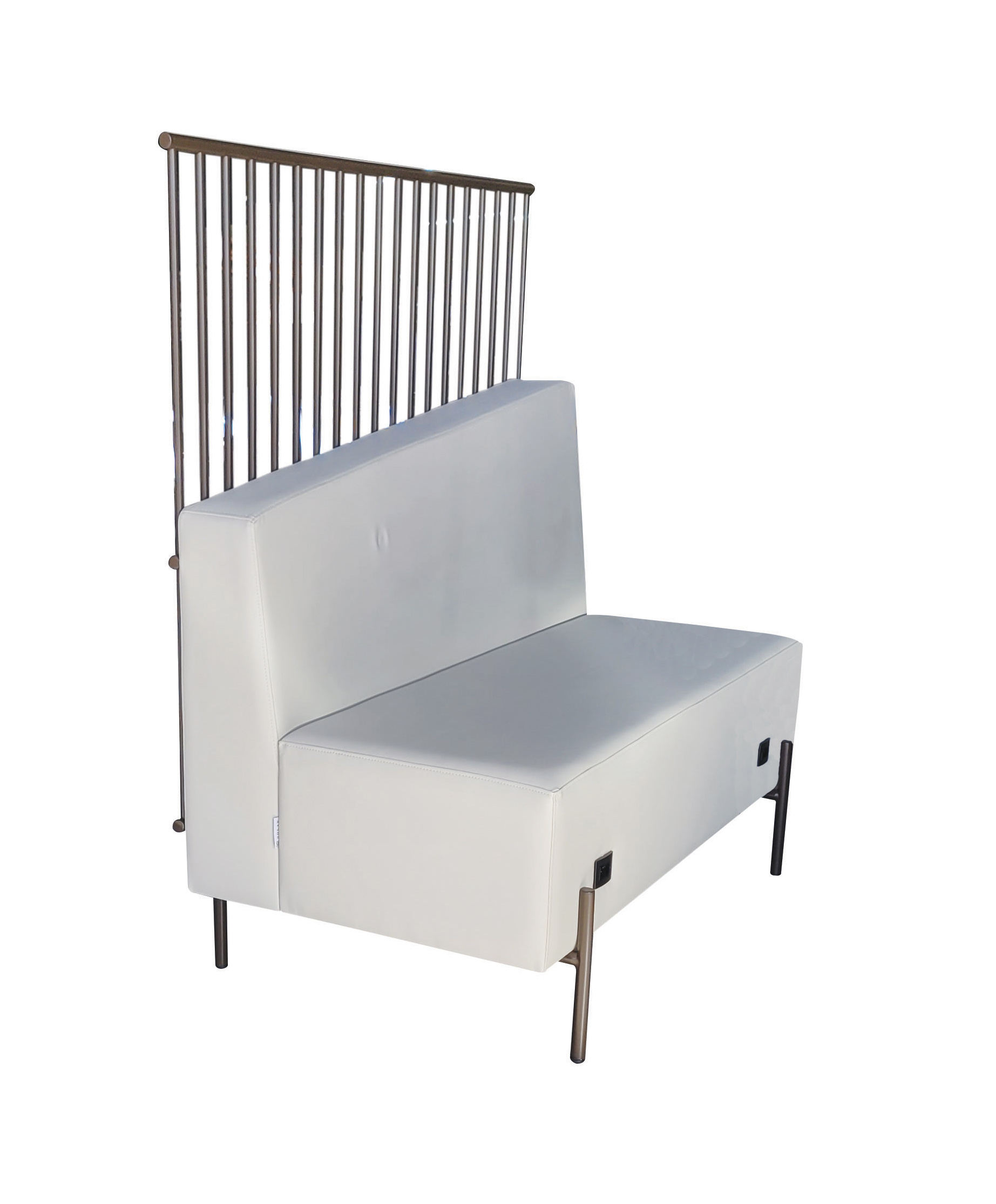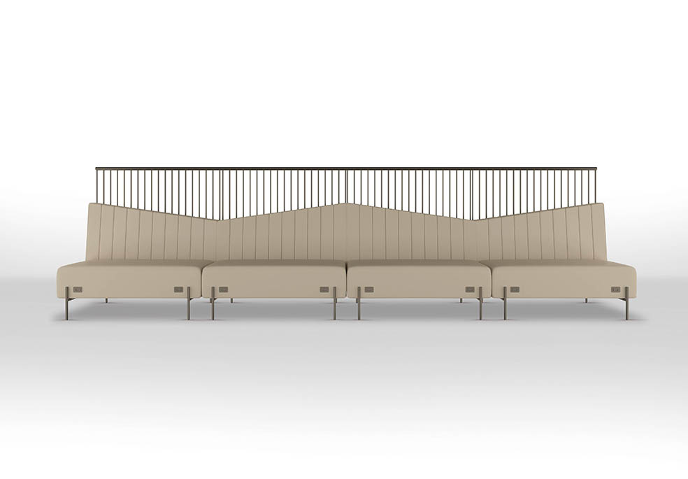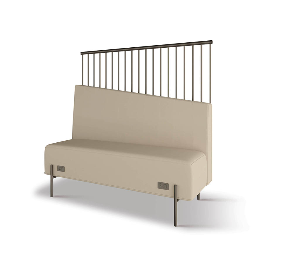 Booth com base e biombo em aço carbono com pintura epóxi, assento e encosto em madeira estofados, encosto inclinado que colocado um ao lado do outro forma uma geometria elegante.