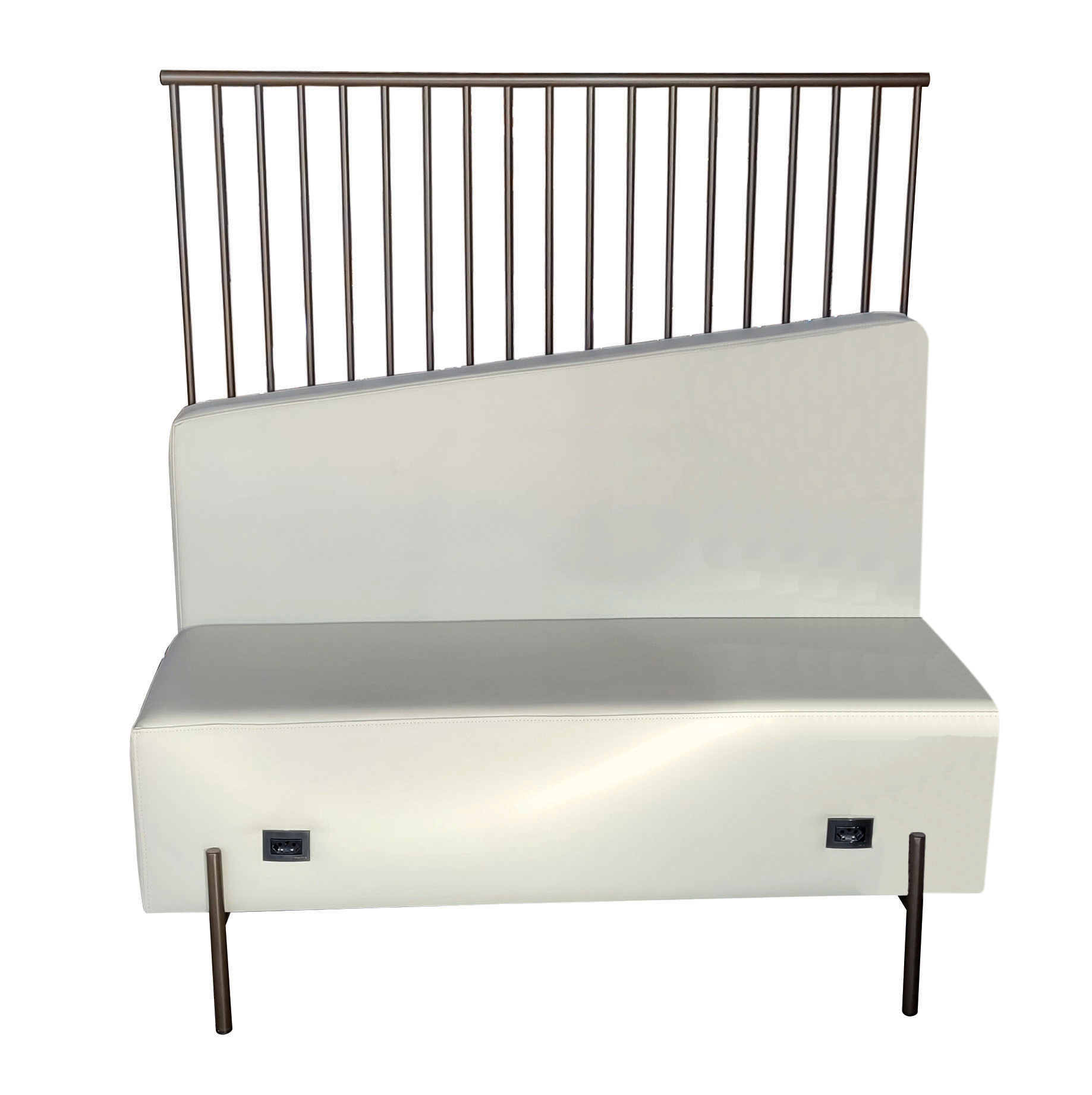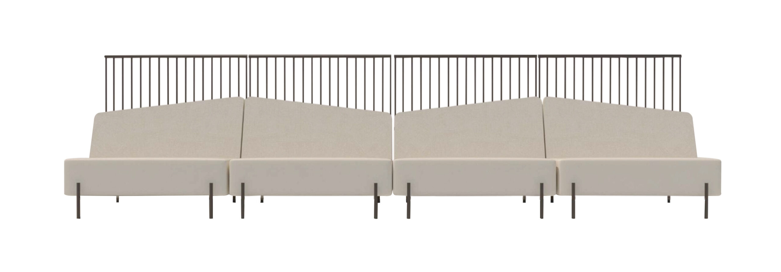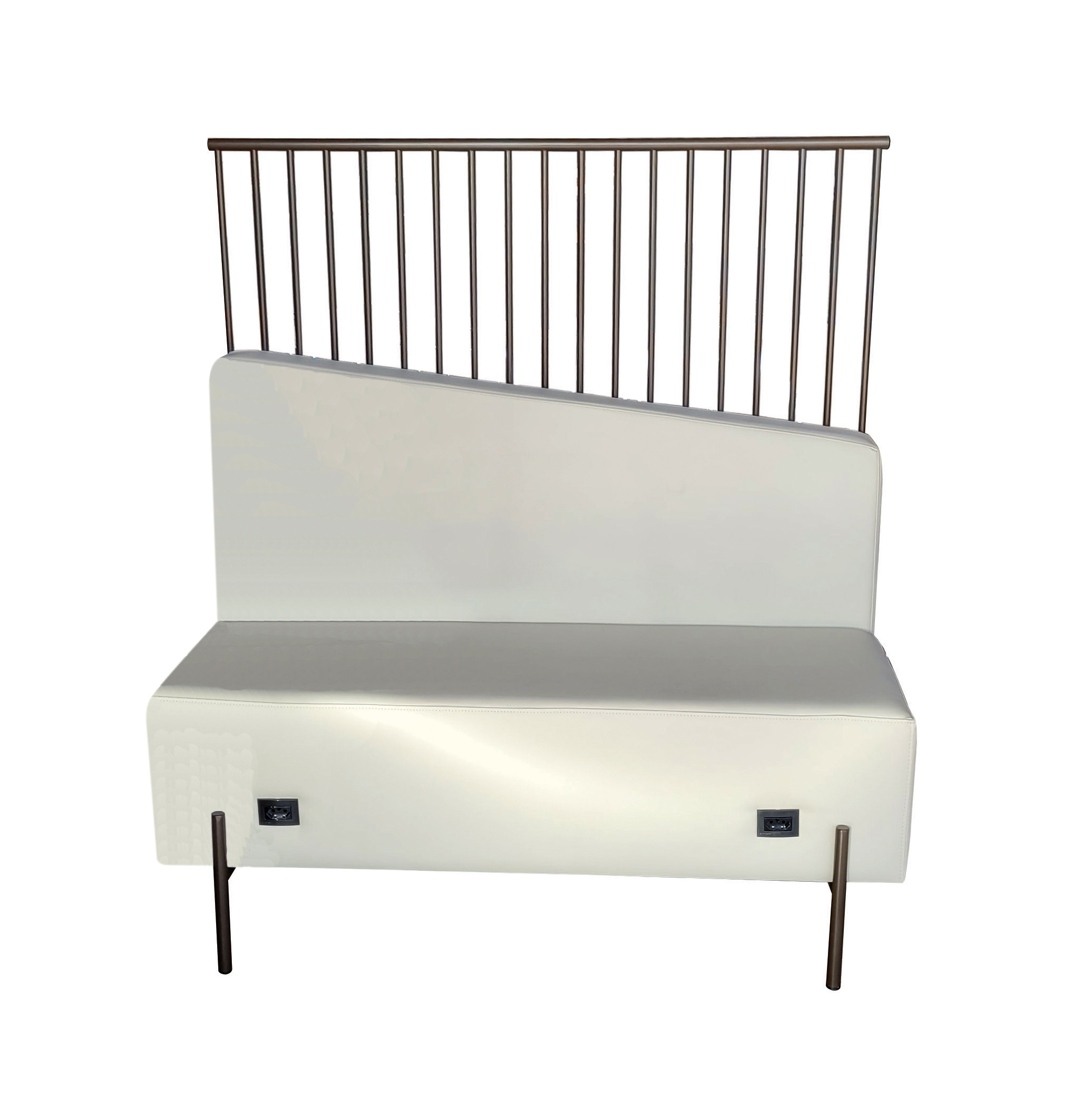 Booth com base e biombo em aço carbono com pintura epóxi, assento e encosto em madeira estofados, encosto inclinado que colocado um ao lado do outro forma uma geometria elegante.