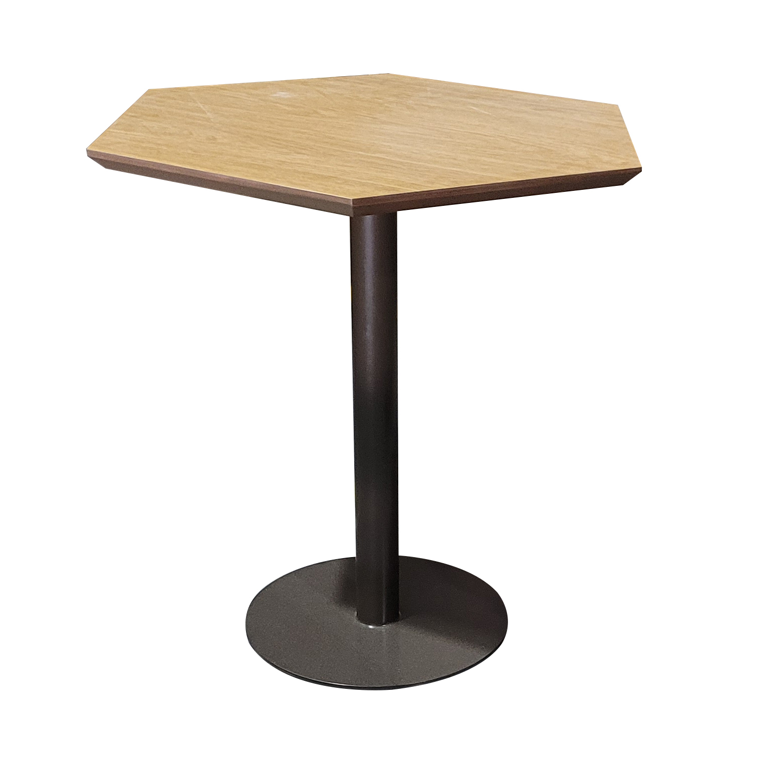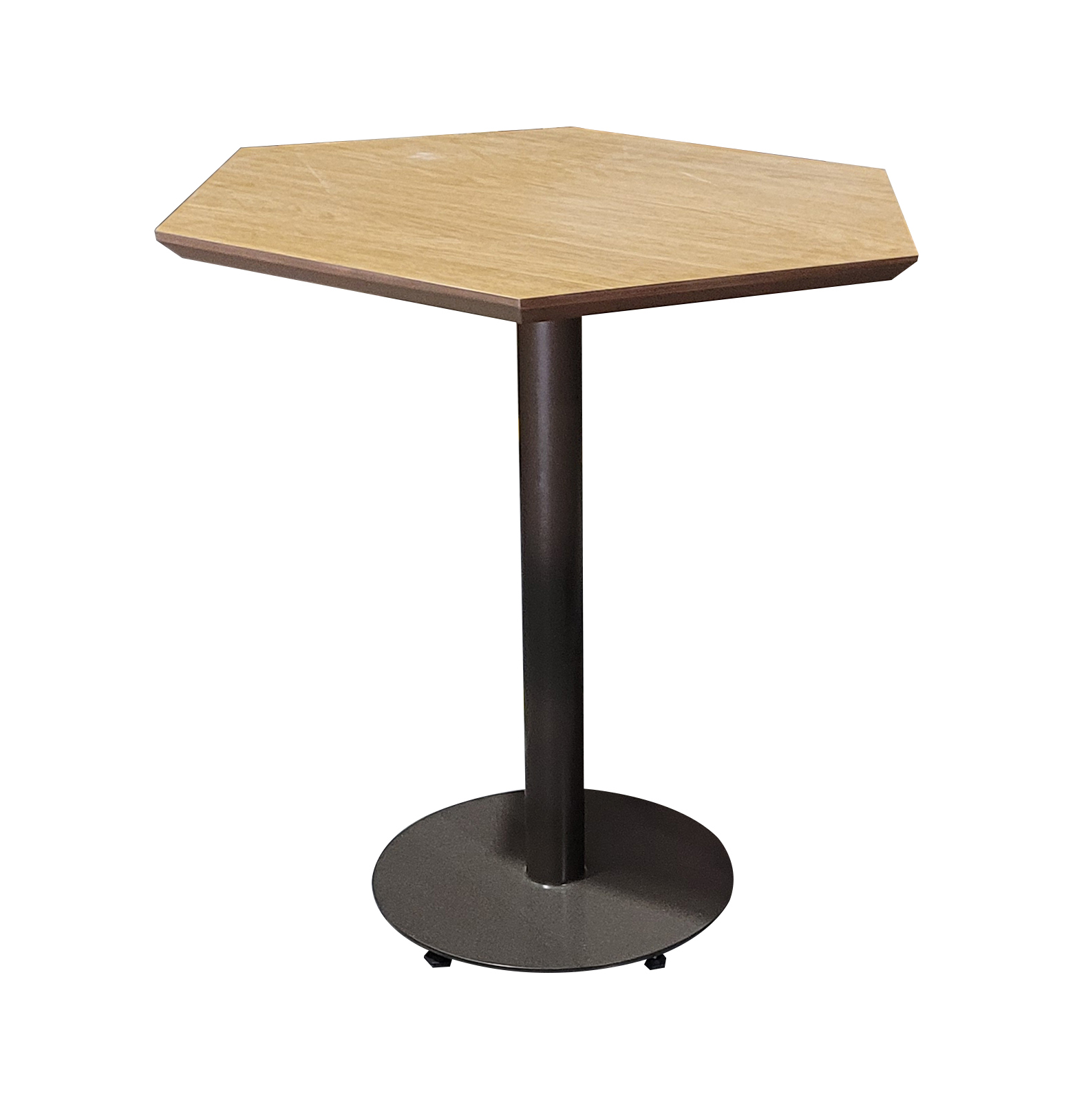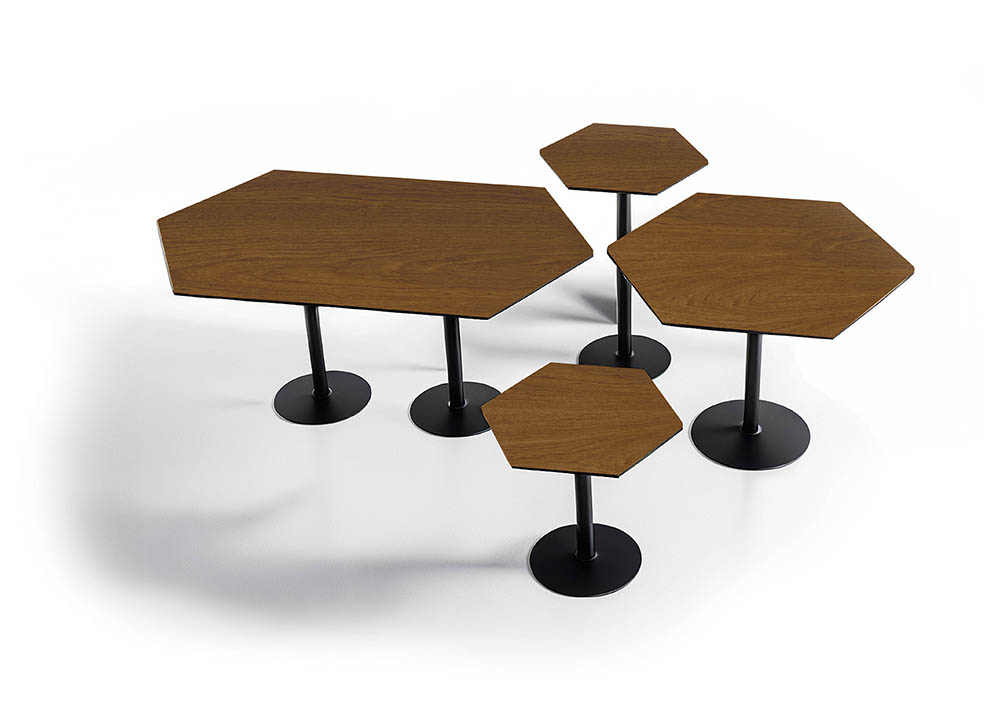 Mesa jantar ou bistrô com base em chapa maciça de aço carbono e tubo da coluna com pintura epóxi, tampo hexagonal em mdf de 25mm revestido em lâmina de madeira natural e tingido, em fórmica ou em laca com vidro sobreposto.