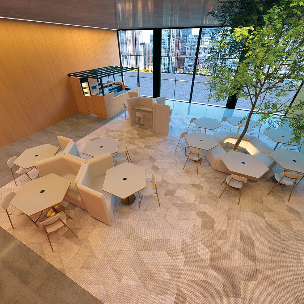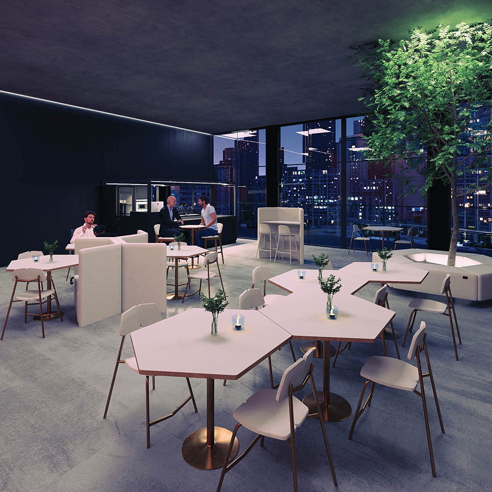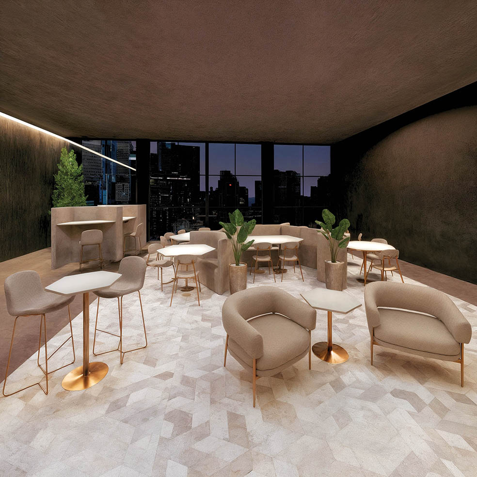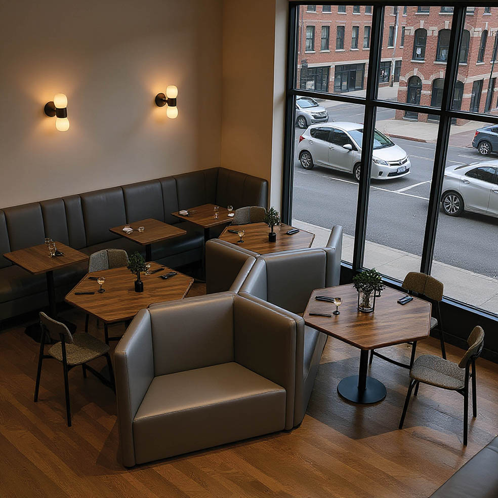Mesa jantar ou bistrô com base em chapa maciça de aço carbono e tubo da coluna com pintura epóxi, tampo hexagonal em mdf de 25mm revestido em lâmina de madeira natural e tingido, em fórmica ou em laca com vidro sobreposto.