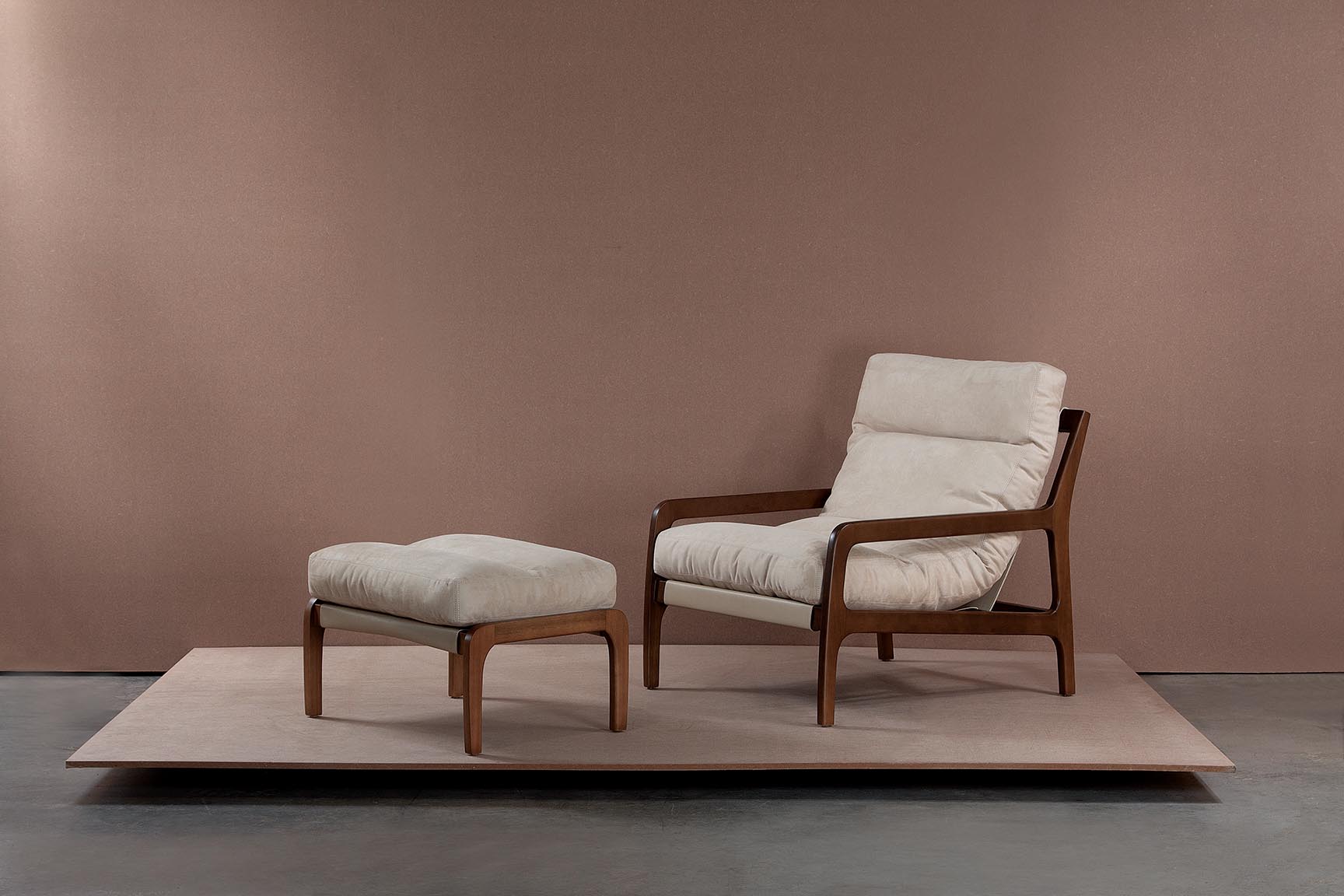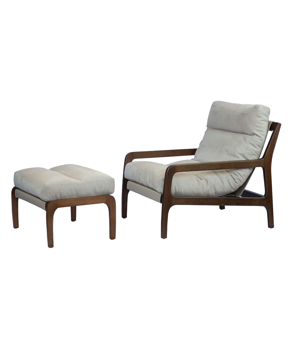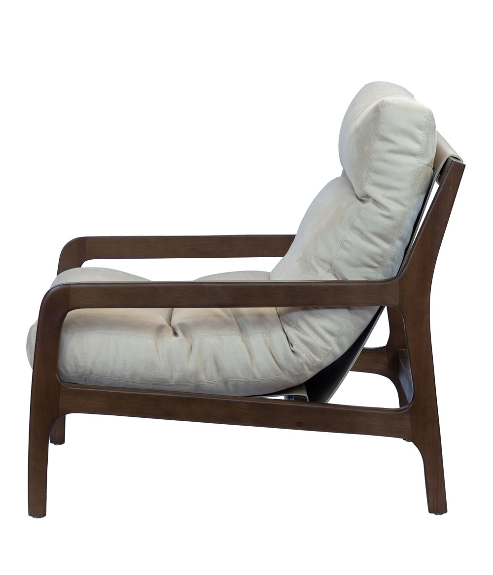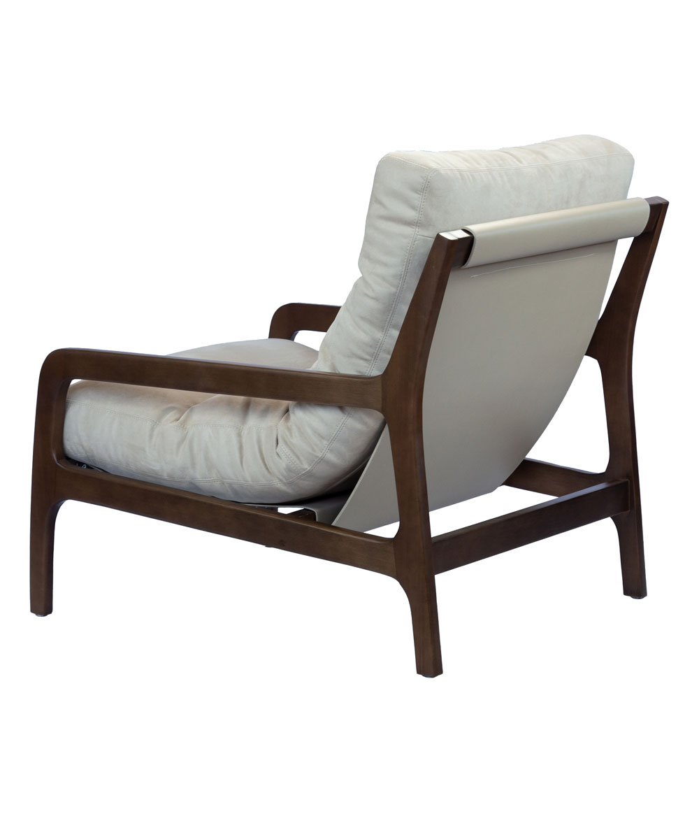 Poltrona com estrutura em madeira de eucalipto tingida, almofada em fibra siliconada estofada, suporte da almofada em couro reconstituido.