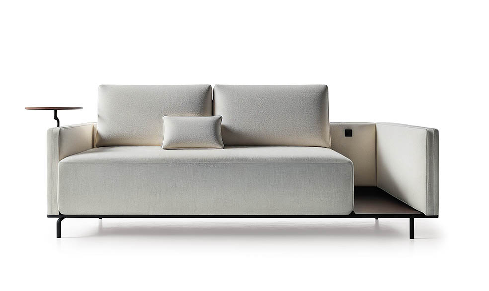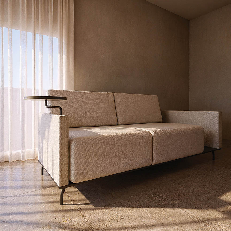 Sofá cama base em aço carbono com pintura epóxi, estrutura em madeira estofada, almofadas soltas que colocadas no espaço da mesa complementam a cama.
